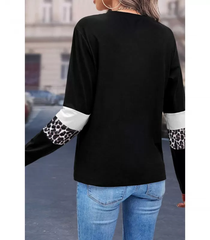 Musta pitkähihainen arkipaita näyttävillä yksityiskohdilla. Väljä paita on ihanan rento ja mukava päällä; jos haluat paidan olevan tyköistuvampi, ota kokosuositusta pienempi koko. Valkoiset ja leopardikuvioiset raidat tuovat näyttävyyttä muuten yksinkertaiseen paitaan.