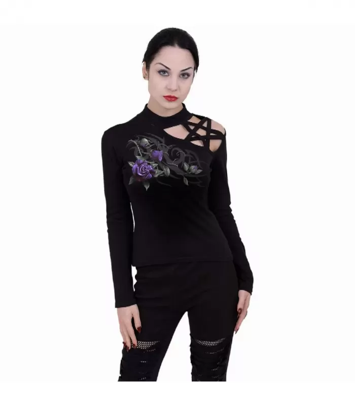 Musta pitkähihainen ruusukuvioinen paita pentagrammiristikolla.