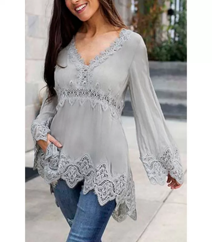 Harmaa pitkähihainen väljä pitsikoristeinen pusero levenevällä helmalla ja levenevillä hihoilla. Pusero ei juurikaan jousta. Ylävartalosta sirorakenteisten ja pienirintaisten kannattaa ottaa kokosuositusta pienempi koko.