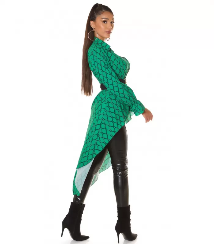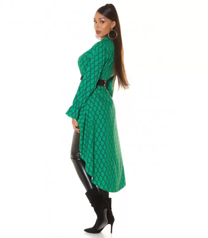 Vihreämusta pitkähihainen printtikuvioinen takaa pidempi pusero vyöllä.