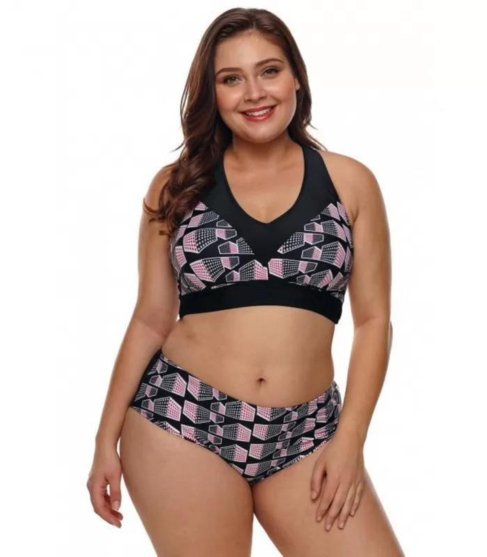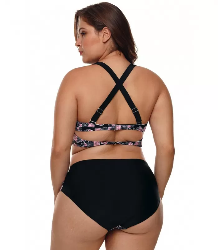 Printtikuvioiset kevyesti topatut v-bikinit ja yhteensopivat korkeavyötäröiset bikinihousut. Sopii parhaiten isorintaisille.