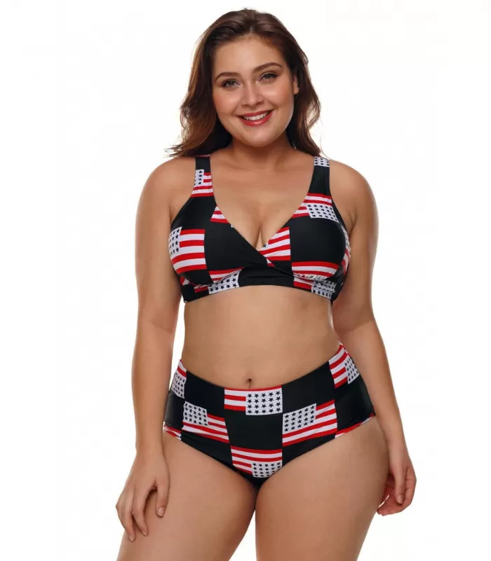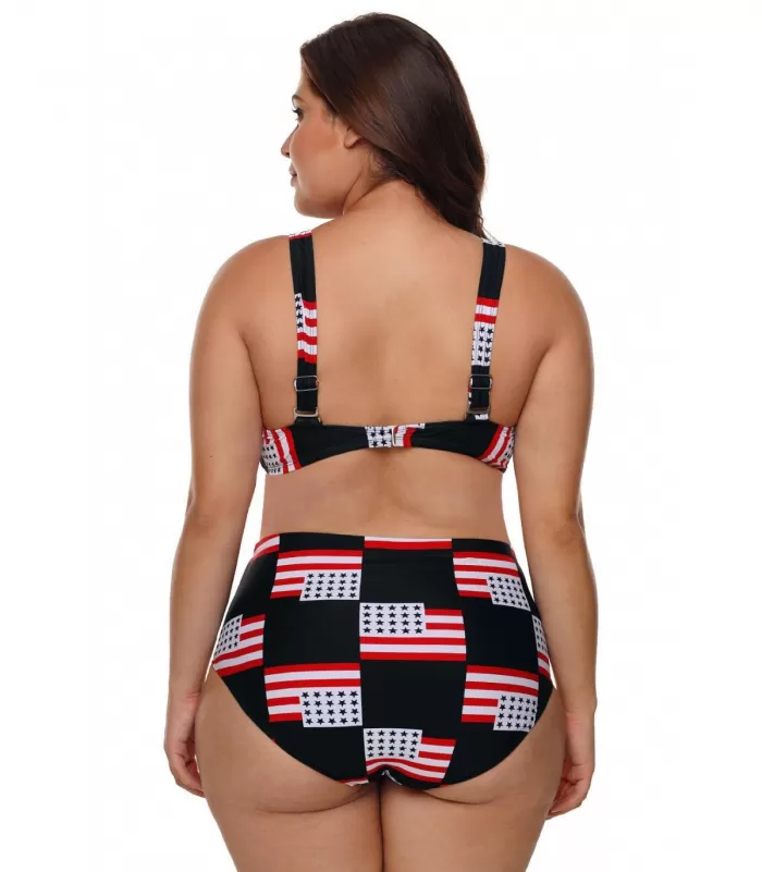 Amerikanlippukuvioiset bikinit ja yhteensopivat korkeavyötäröiset bikinihousut. Kaksiolkaimiset kevyesti topatut bikiniliivit sopivat parhaiten n. C-D -kuppisille.