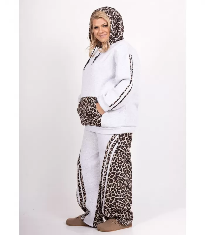 Ihana plus koon oloasusetti, jossa viihdyt koko päivän aamusta iltaan. Harmaa leopardikuvioinen huppari plus koossa on superrento käyttää, mutta leokuvioiset yksityiskohdat tuovat tyyliin näyttävyyttä. Mukana tulee täydellisesti yhteensopivat harmaat XL olohousut. Sivuilla leoraidat ja takaa leveälahkeiset collegehousut ovat kokonaan leopardikuosia. Vyötäröllä joustava resori ja kiristettävät nauhat. Käytä yhdessä tai erikseen!