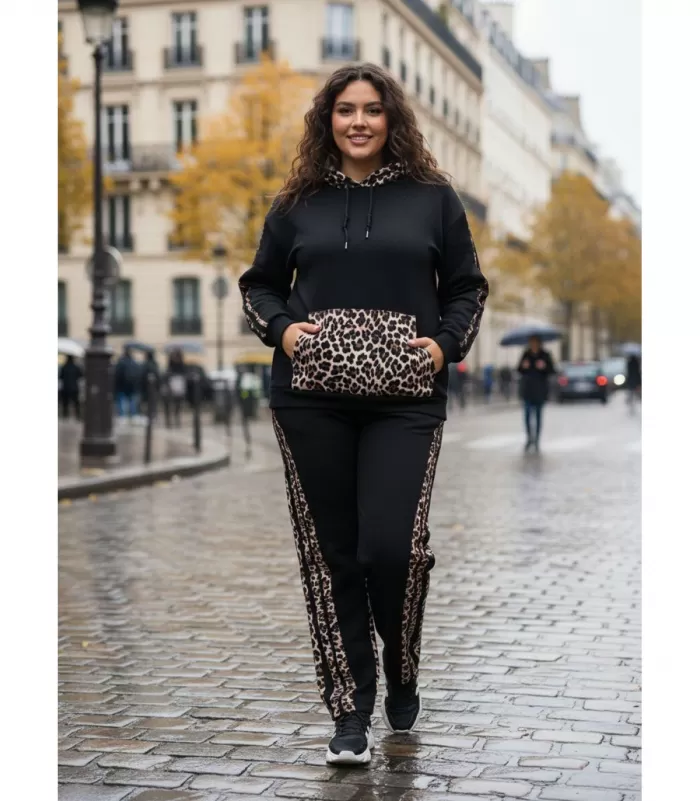 Ihana plus koon oloasusetti, jossa viihdyt koko päivän aamusta iltaan. Musta leopardikuvioinen huppari plus koossa on superrento käyttää, mutta leokuvioiset yksityiskohdat tuovat tyyliin näyttävyyttä. Mukana tulee täydellisesti yhteensopivat mustat XL olohousut. Sivuilla leoraidat ja takaa leveälahkeiset collegehousut ovat kokonaan leopardikuosia. Vyötäröllä joustava resori ja kiristettävät nauhat. Käytä yhdessä tai erikseen!