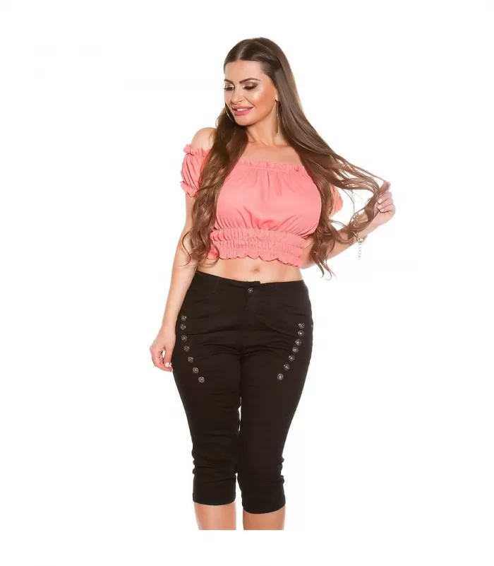 Mustat nappikoristeiset caprit.